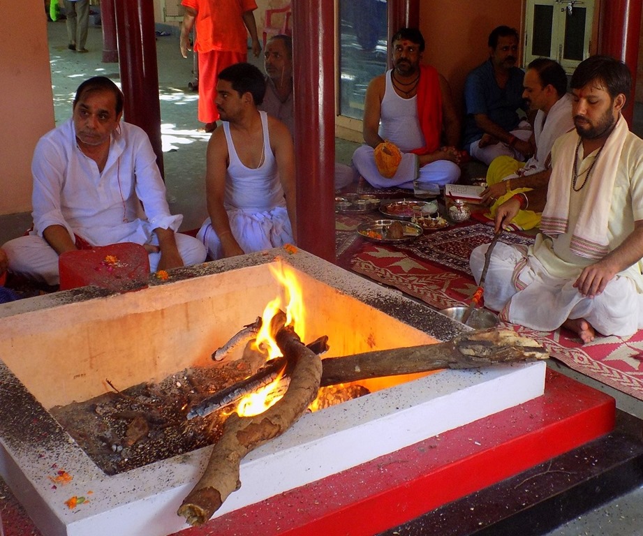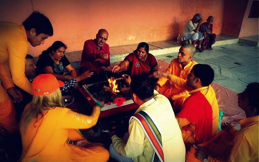 Po powrocie do aśramu naszym oczom ukazała się wstępna pudża z ofiarowaniem obiaty do ognia i recytacją hymnów wedyjskich (niezwykle pięknie i śpiewnie to brzmi):