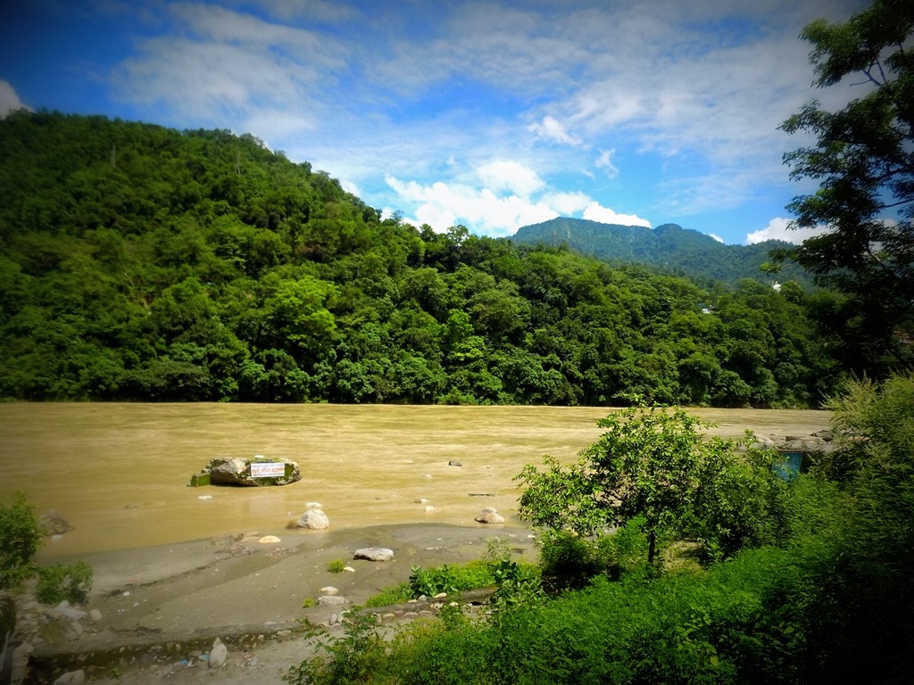 A Ganga-ji w niewielkiej odległości od ghatów spokojnie kontynuuje swój wzburzony monsunem bieg poprzez dżunglę: