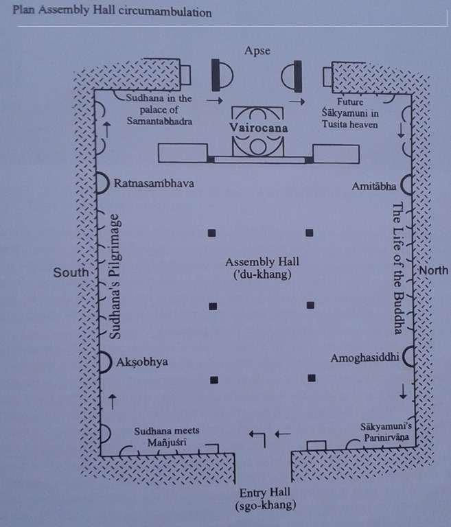 Wystarczy jednak wejść do Sali Zgromadzeń (tyb. ‘Du-khang), by doświadczyć tej mocy, owej “Jej”, o której w pierwszym akapicie napisałam. Sala może nie jest wielka, ale na pewno dość duża, pogrążona w ciemności, która zdaje się kryć w sobie znacznie więcej niż tylko duże statuy strażników i buddów czterech kierunków (Ratnasambhawa, Amitabha, Akszobhja, Amoghasiddhi). Ogromna rzeźba czterogłowego Wairoczany, ucieleśnienia Pustki, jednego z pięciu buddów mądrości (czterej pozostali już zostali wymienieni). Wairoczana stanowi ich esencję. Po lewej stronie, za Wairoczaną, znajduje się ściana ze zwojami-zapisami nauki buddyjskiej, a po prawej przestrzeń Buddy, przebywającego w niebie Tuszita. Zdjęcia wnętrza nie są możliwe, więc jedynie plan: