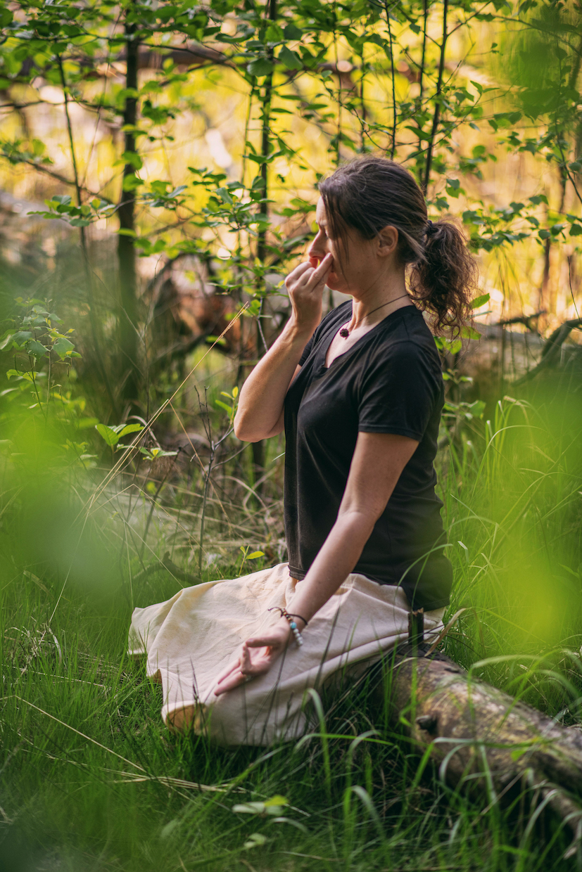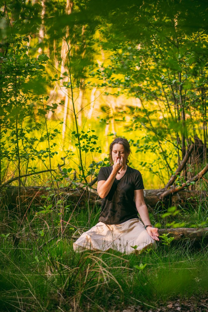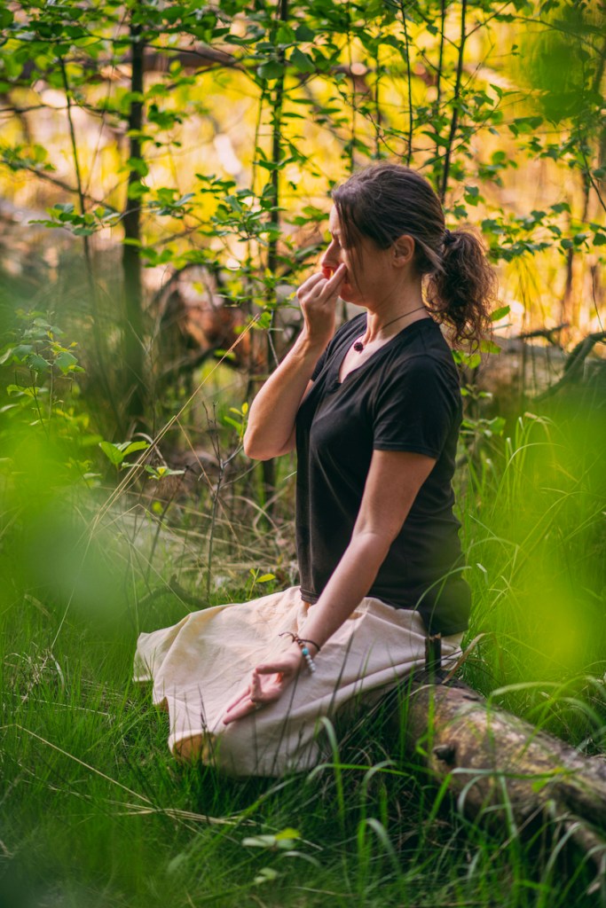 Znajdź ciche, spokojne miejsce – może to być polana, miejsce pod drzewem lub brzeg jeziora. Usiądź wygodnie w stabilnej pozycji – na macie, kocu lub po prostu na ziemi. Zamknij oczy, ułóż dłoń w wisznu-mudrę (zwaną także nasika-mudrą lub mrigi-mudrą) – i delikatnie zamknij prawe nozdrze kciukiem. Wdychaj przez lewe nozdrze i wstrzymaj wdech, następnie zamknij lewe nozdrze palcem serdecznym i wydychaj przez prawe nozdrze, weź wdech prawnym nozdrzem i wstrzymaj oddech, zatkaj kciukiem prawe nozdrze i wykonaj wydech lewym nozdrzem. Kontynuuj naprzemienny oddech przez 10–15 minut, nie forsując oddechu, ale utrzymując go miękkim i uważnym – niech świadomość pozostanie w oddechu, śpiewie ptaków i zapachu lasu, polany, morza…